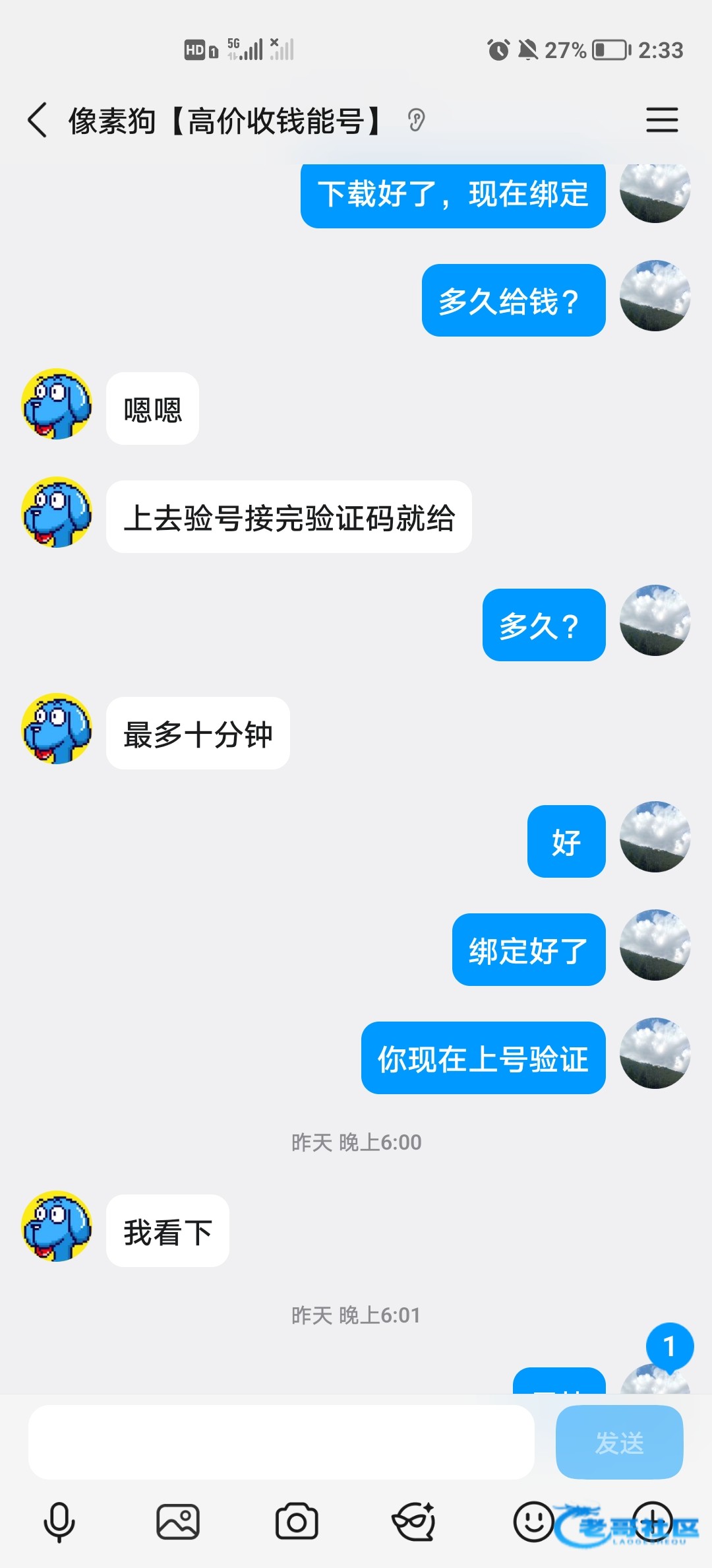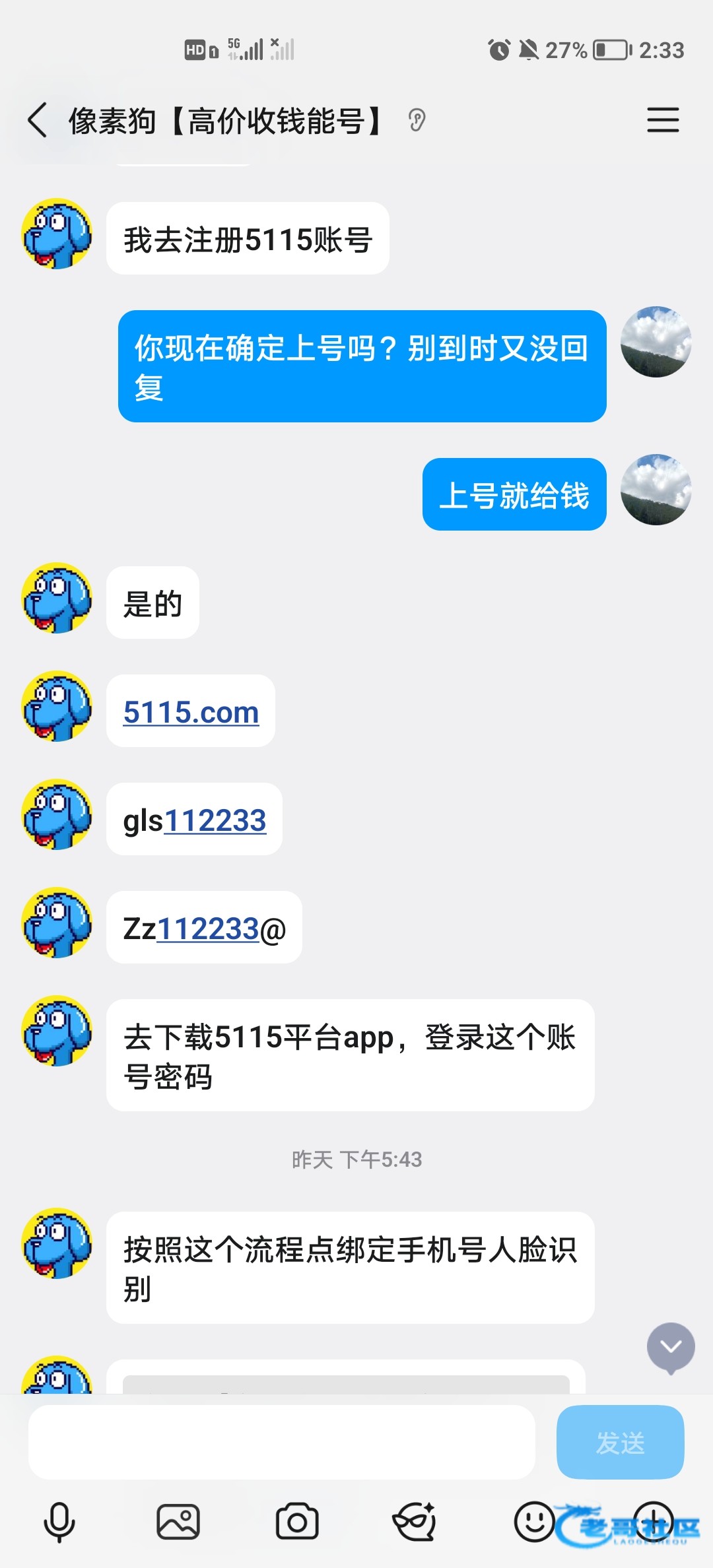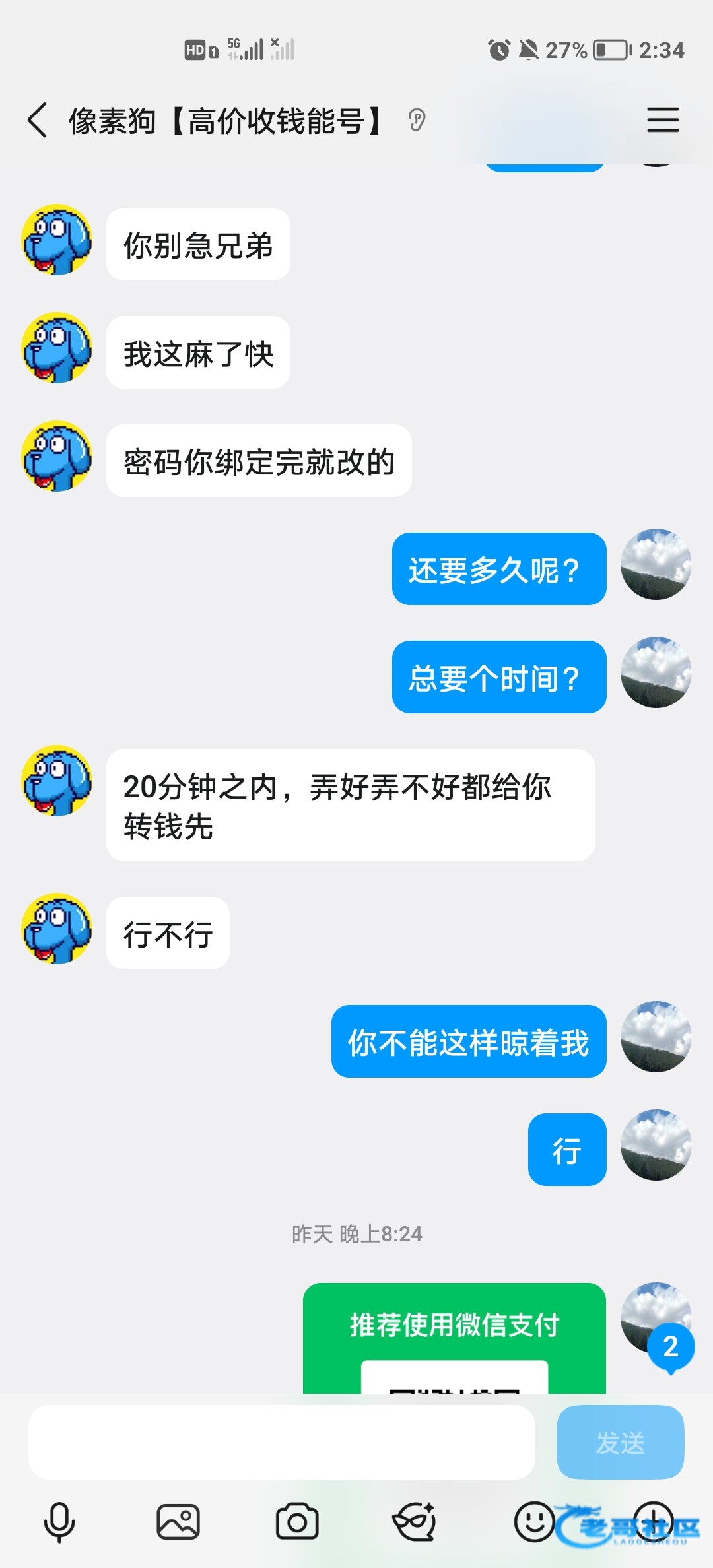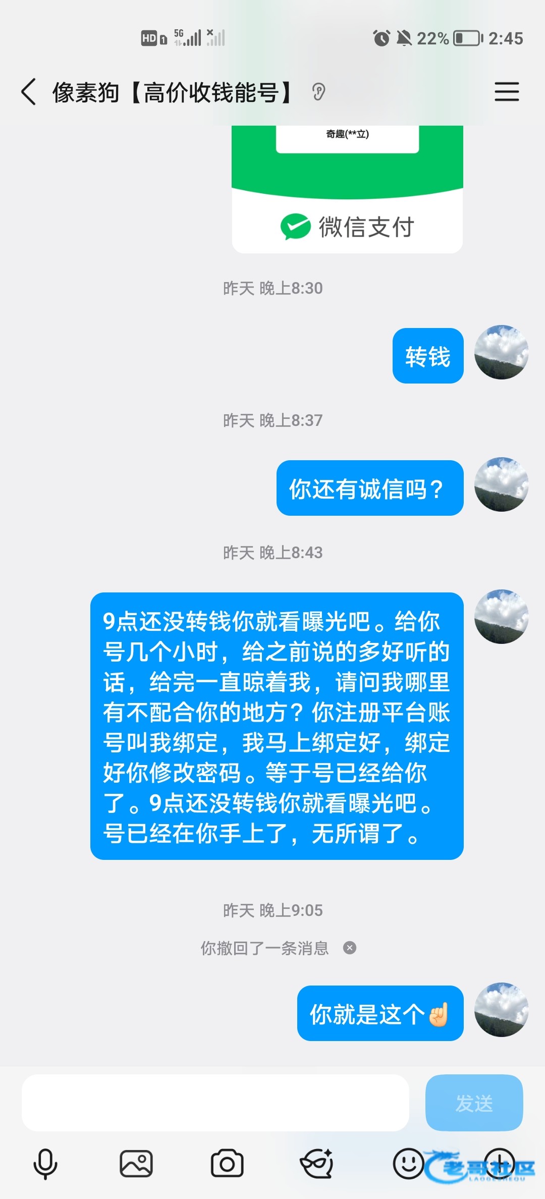 今天卖钱能钱包账号又被现实社会教育了一回,网上冲浪,每天上一当,当当不一样。也是怪自己傻逼太着急了。提醒各位老哥网上做交易要考虑周全,不能太着急,以免造成不必要的损失。