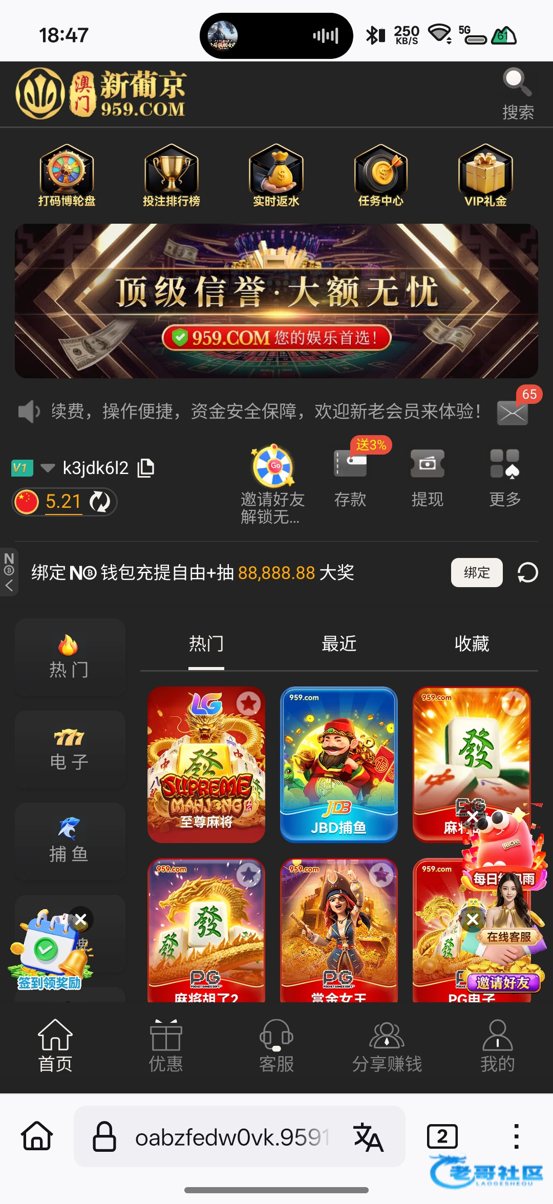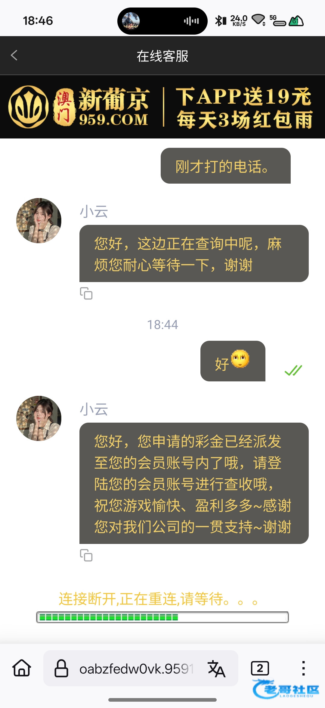 刚才打电话联系客服,送了个5块钱彩金勿充值 959.com