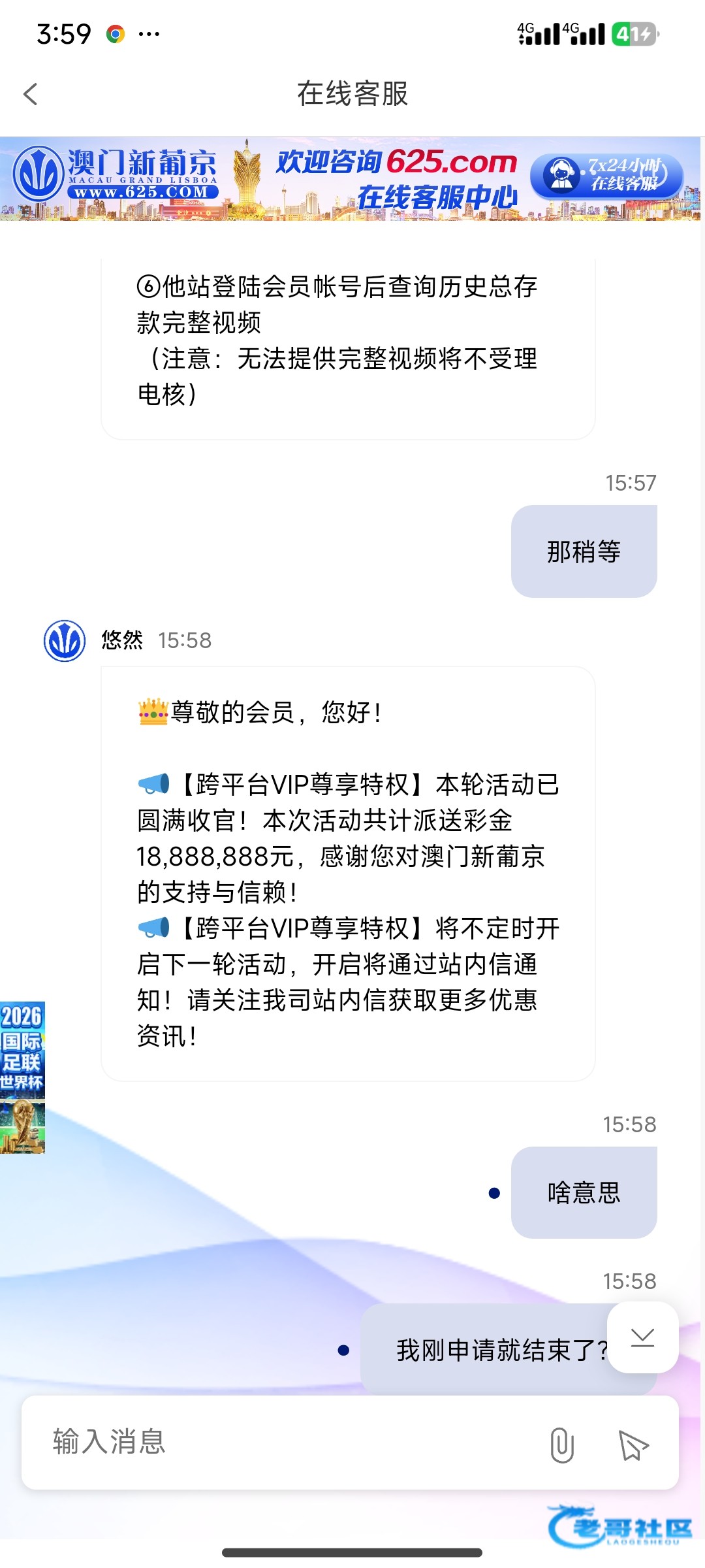 48分输完充值的200,49分去申请,客服还找我要了账号密码,给完以后58分告诉我活动结束,牛逼这他妈也能反撸我200