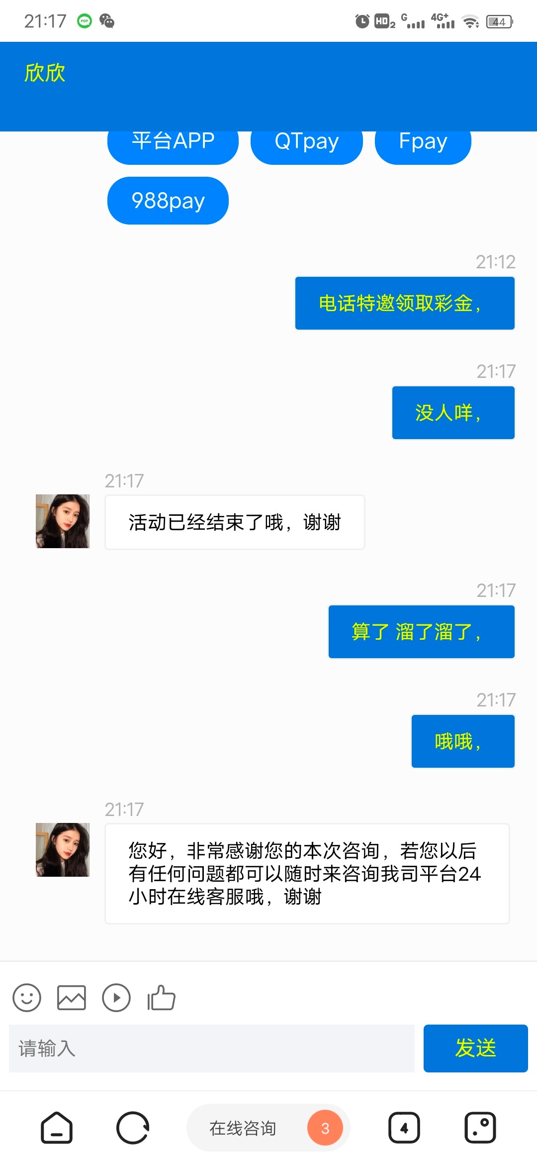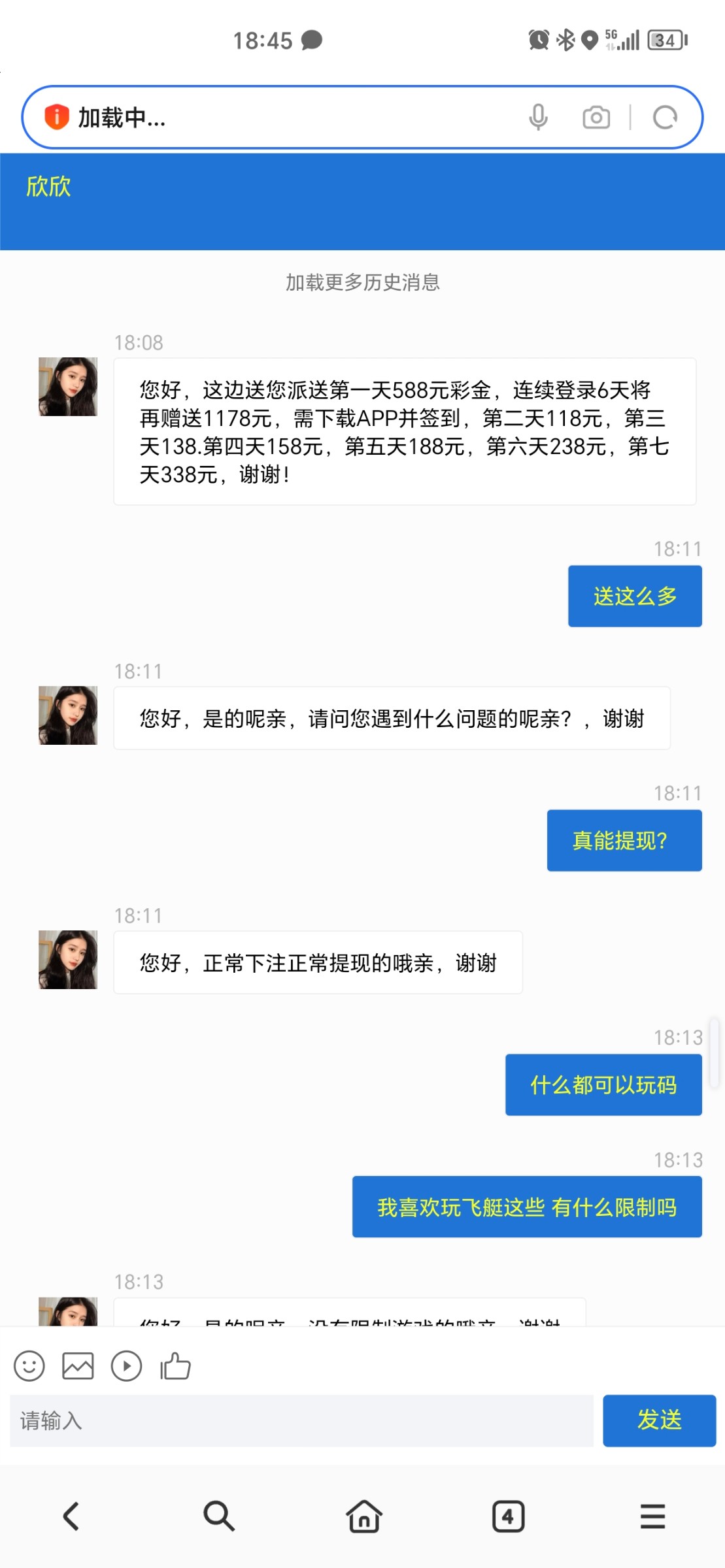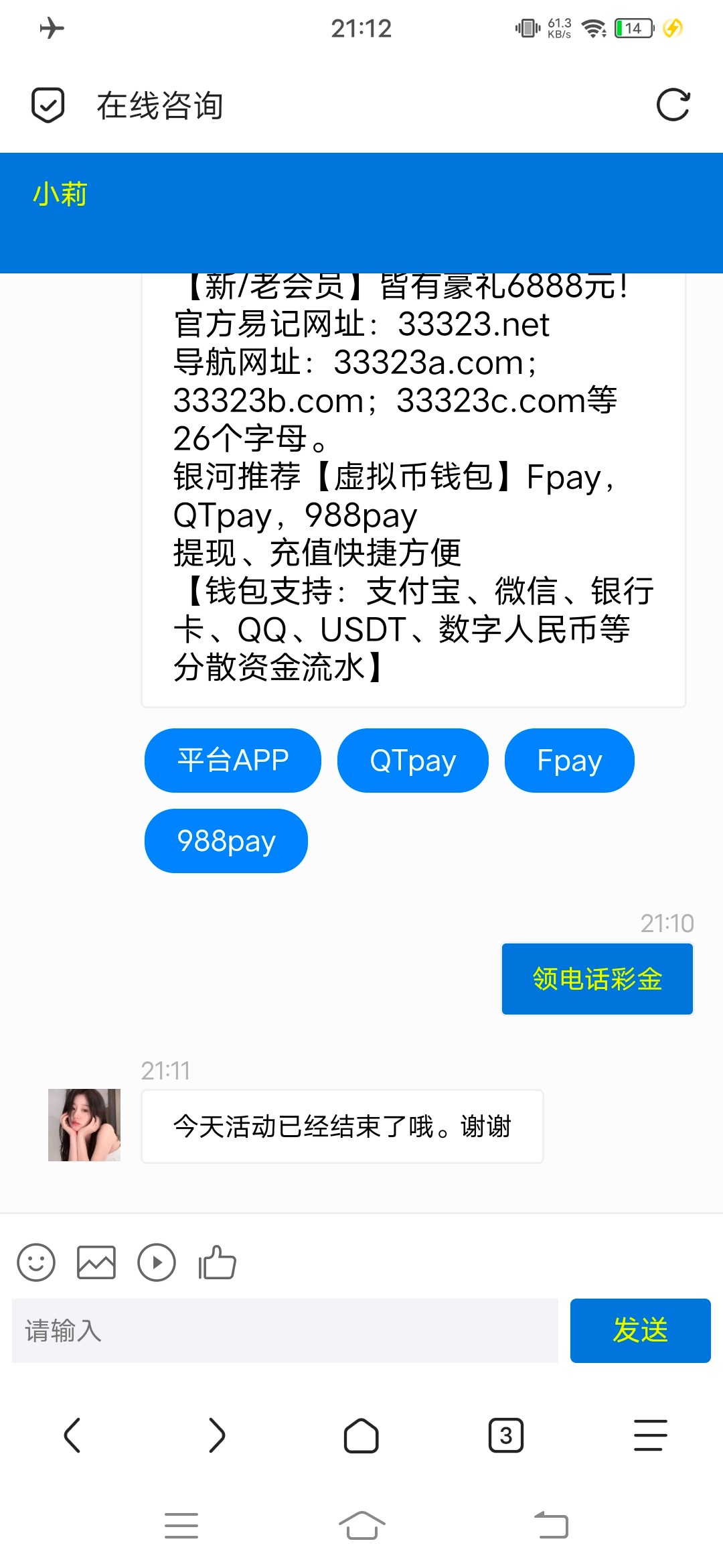 您好,申请特邀彩金需用,接听手机号码验证登陆游戏账户。(0请您等待《20分钟—30分钟》后自行刷新游戏账户查收哦。(0特邀彩金是系统自动派发账户《18元—888元》最幸运可获得最高888元哦。客服无权添加彩金哦。请您理解。祝您:好运连连、中大奖!谢谢