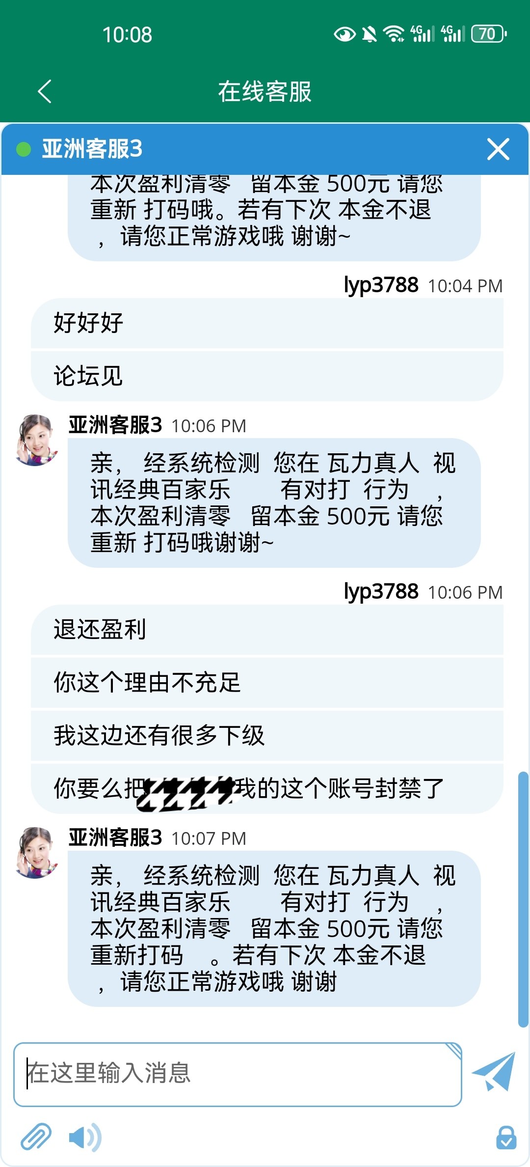 精彩台5115玩不起开始黑款了,全程一个账户在玩,没有一起压闲庄,500不给出款