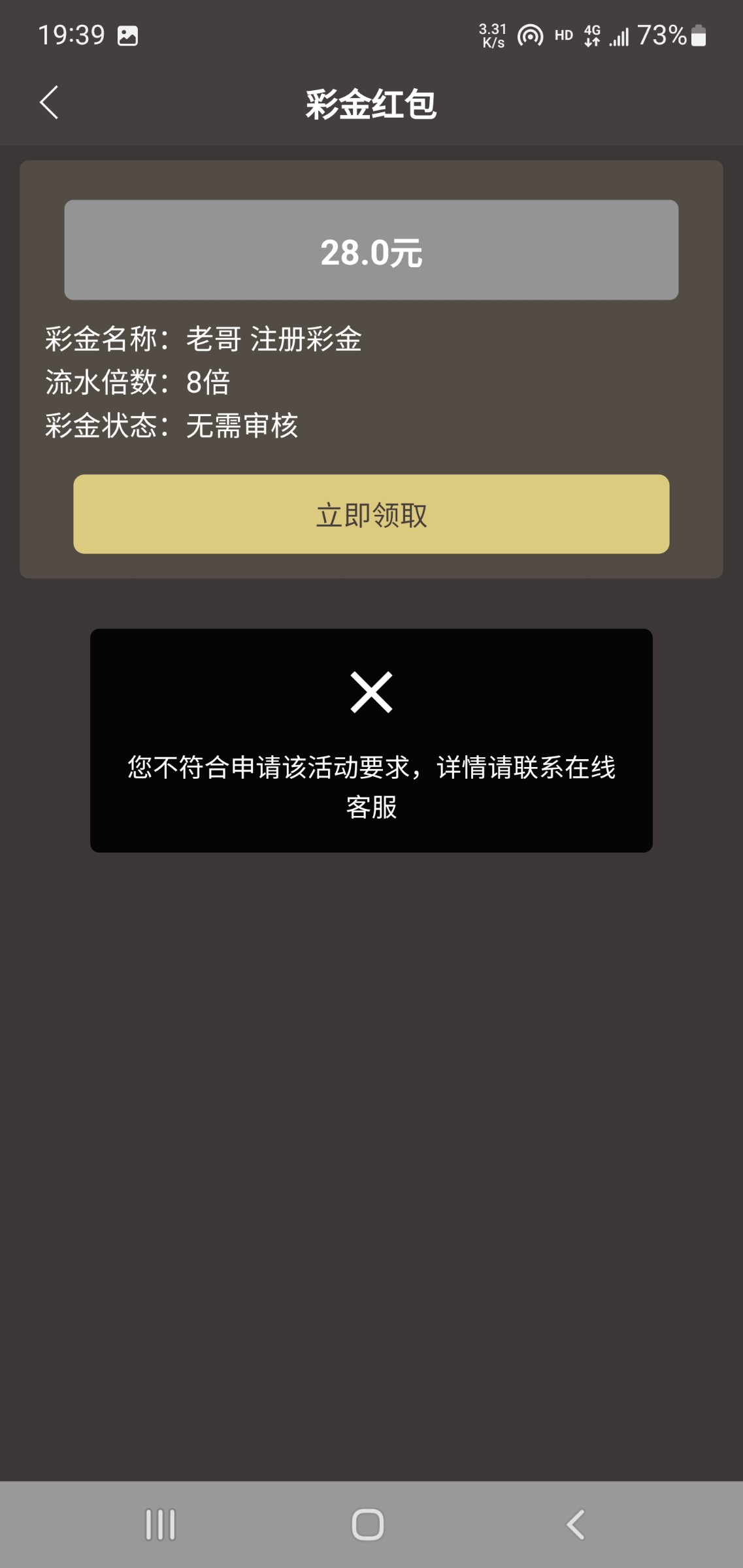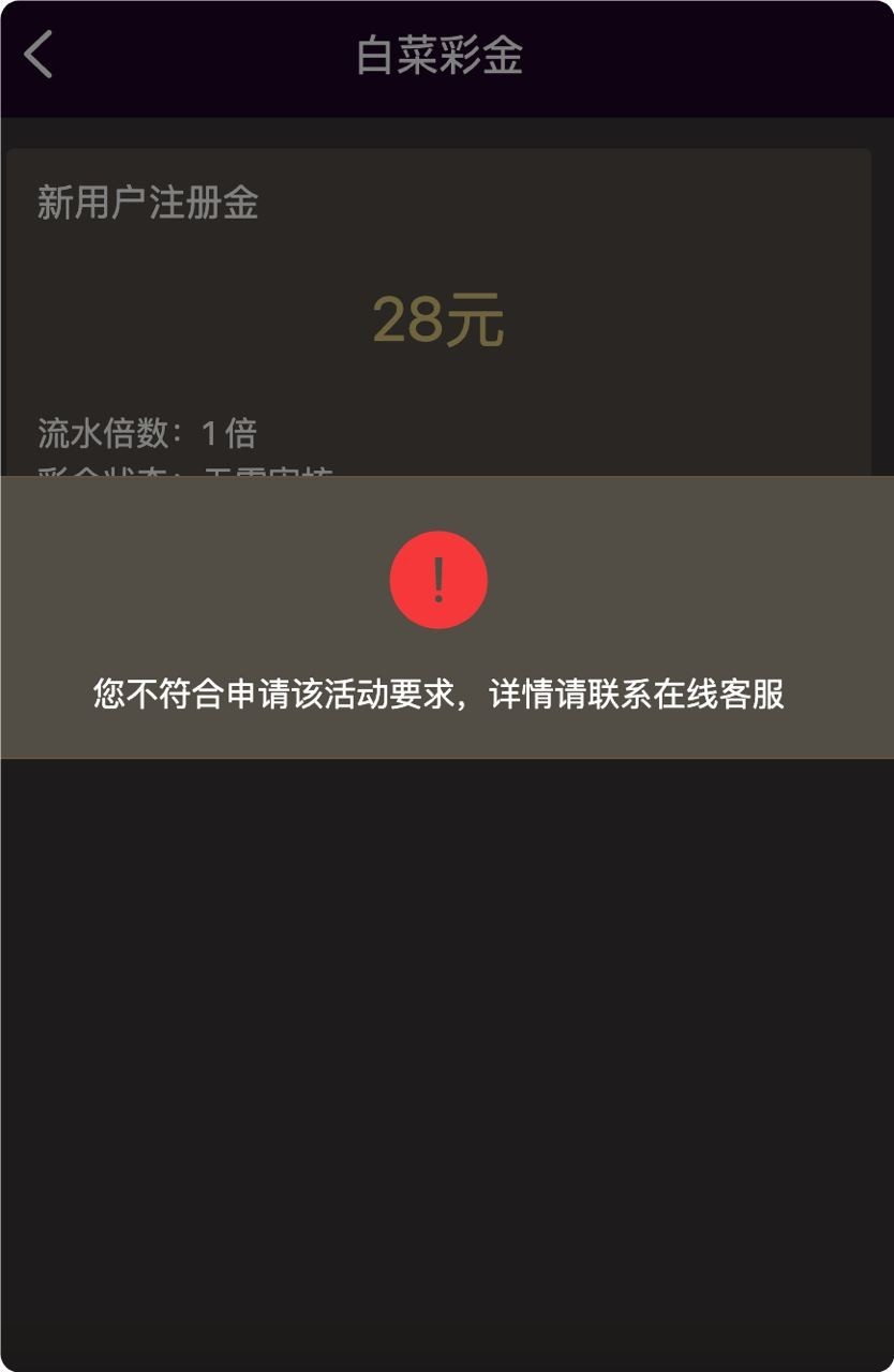 太恶心了,注册彩金不给领,充值包赔都参加了,一点水都没,结果注册彩金都不给领