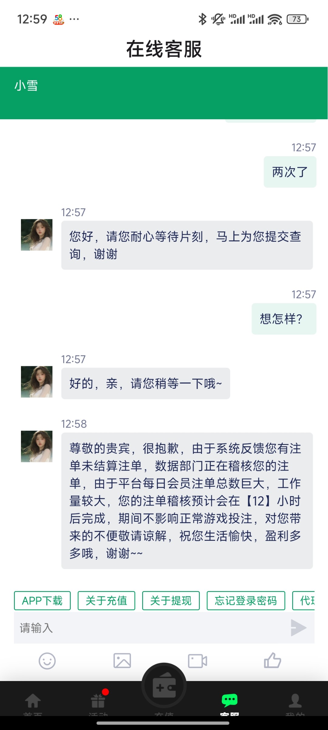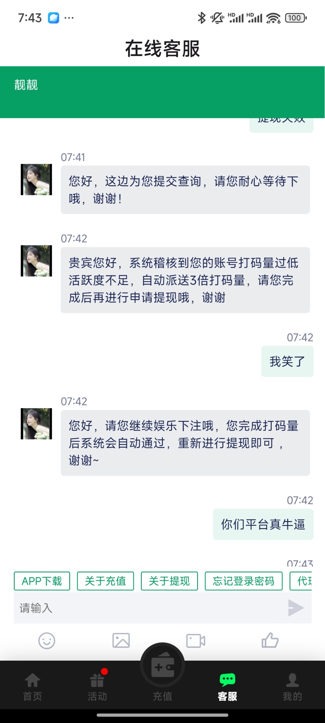 第一次提现失败说什么活跃的不够让在打三倍水 第二次又说什么注单有问题