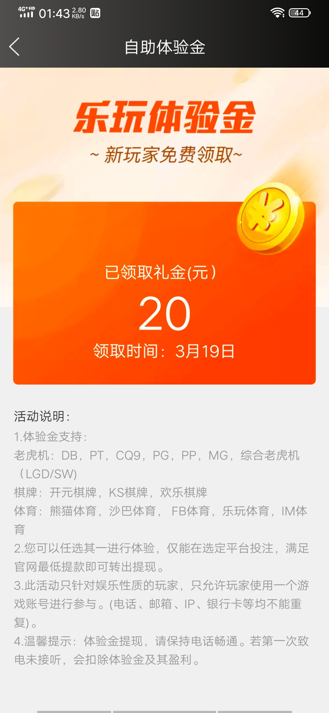 我领了20的体验金,出了500多,一分没充