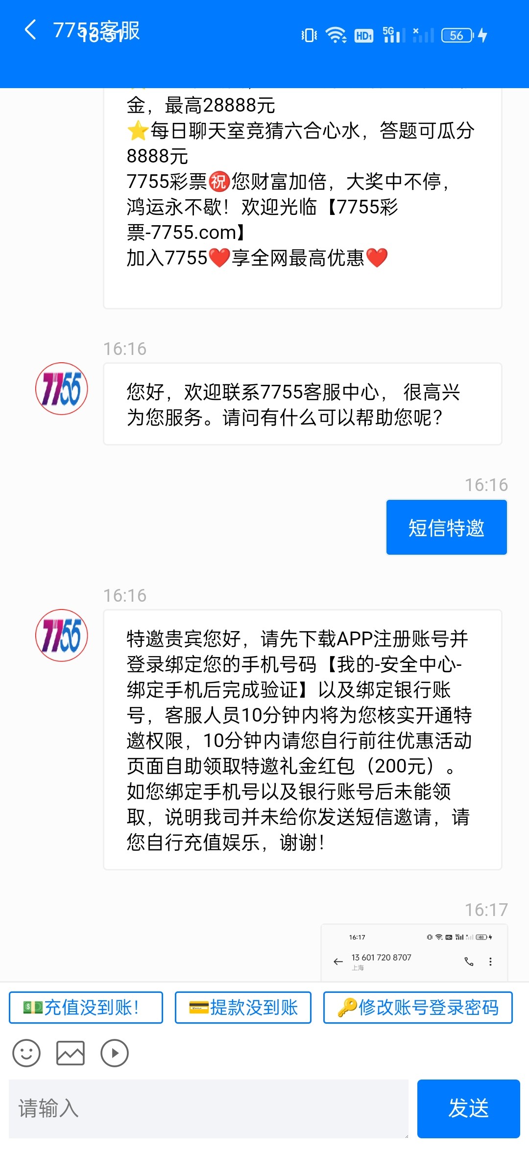 7755短信特邀 没打出来 自己去碰瓷一下 56789.qpon  注意:不要充值 出款自测