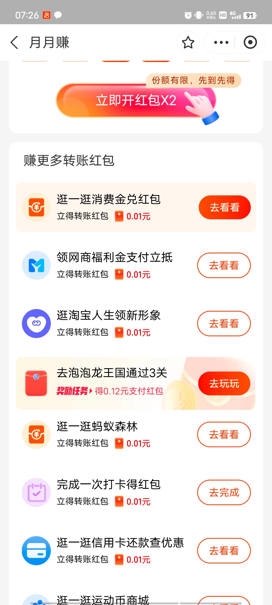 支付宝月月赚里面有任务,倒下来好几天没吃饭的老哥可以看下