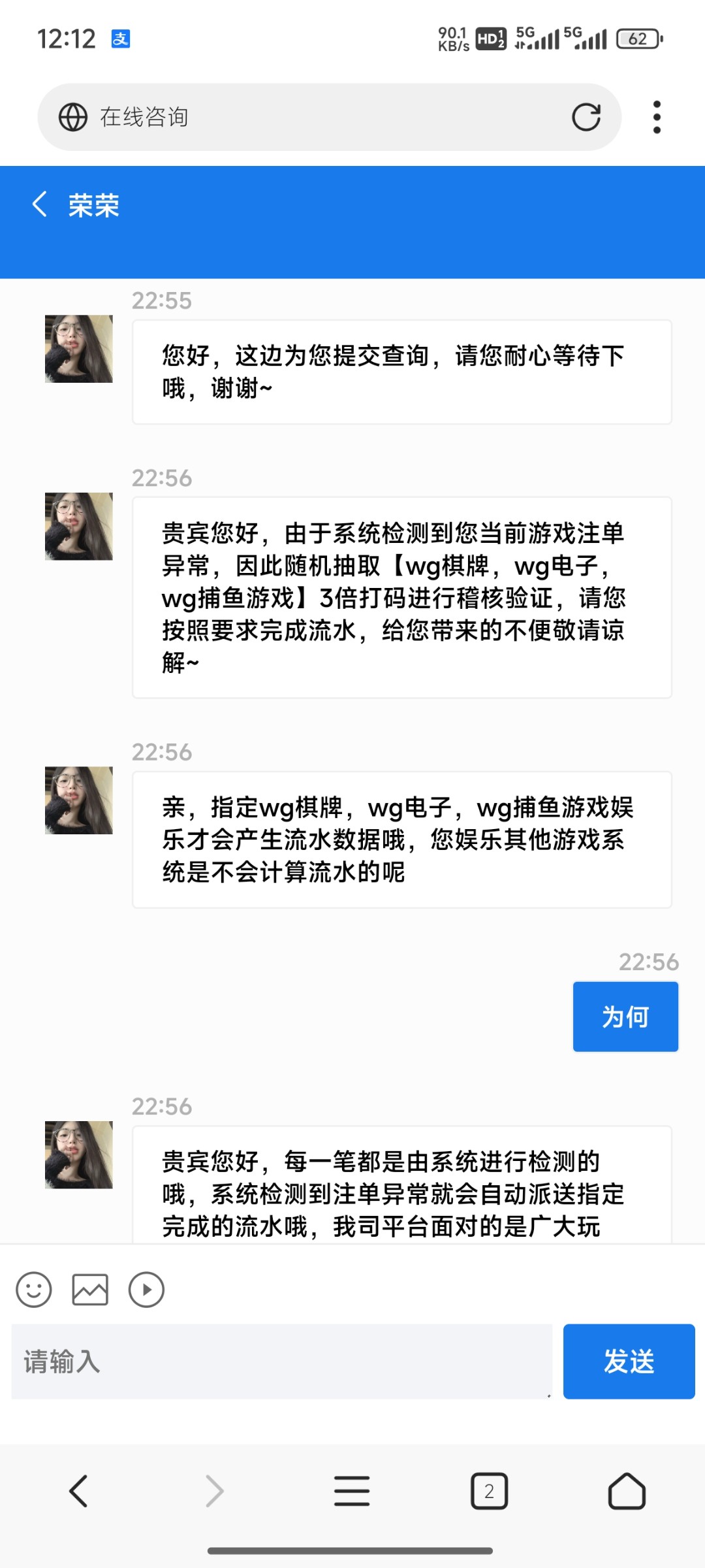 是不是6666这个台,我上次充100提500叫我充500才能提,我没充后面几天我去看把我钱全扣了,又后来过了好几天,我去我问客服说我账号有500余额怎么不见了,然后东扯西扯,他给我退了100叫我打wg流水,我去打打到500然后提现到账了,傻逼平台一个