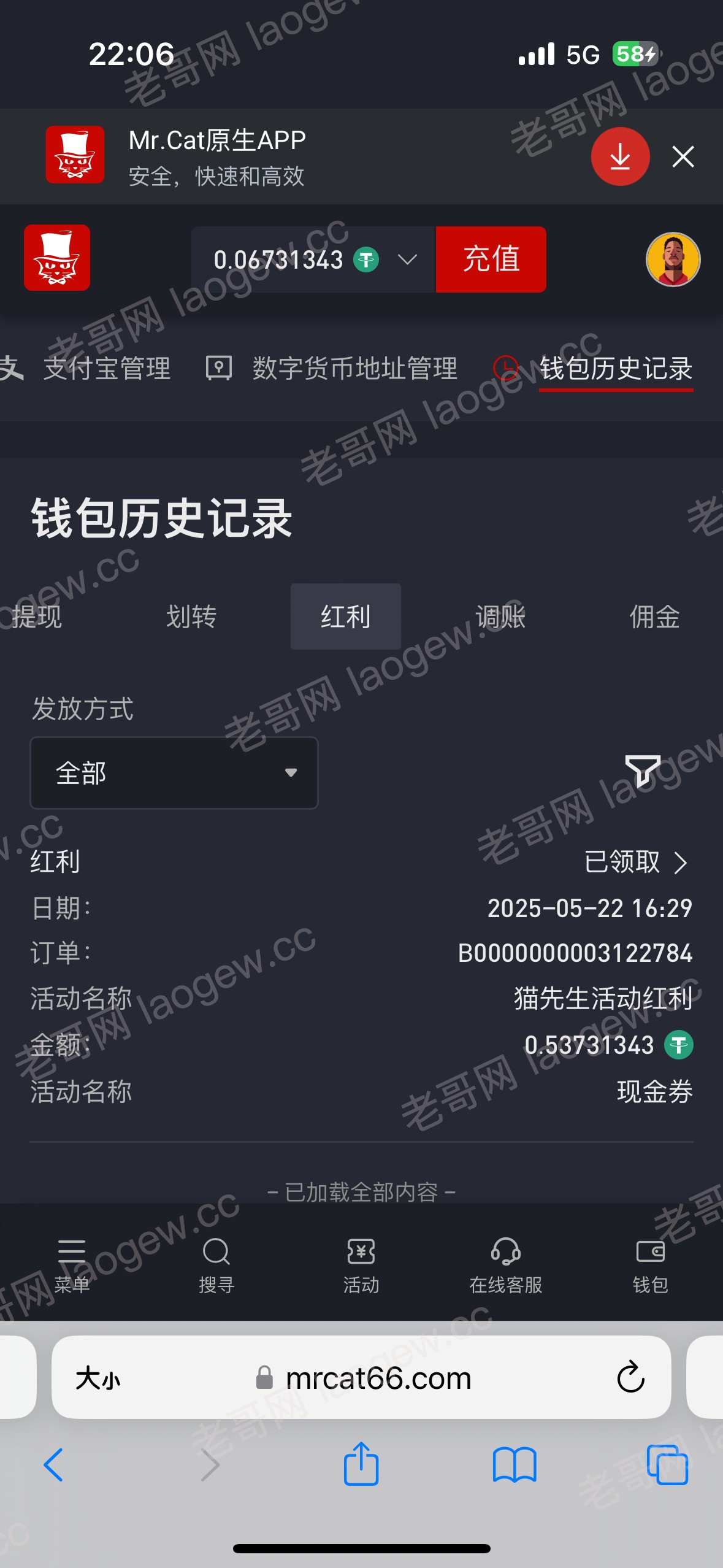上次论坛发的猫先生免费竞猜奖励发了,我给了我0.5u,麻1打到7u,剩5u去真人挂了