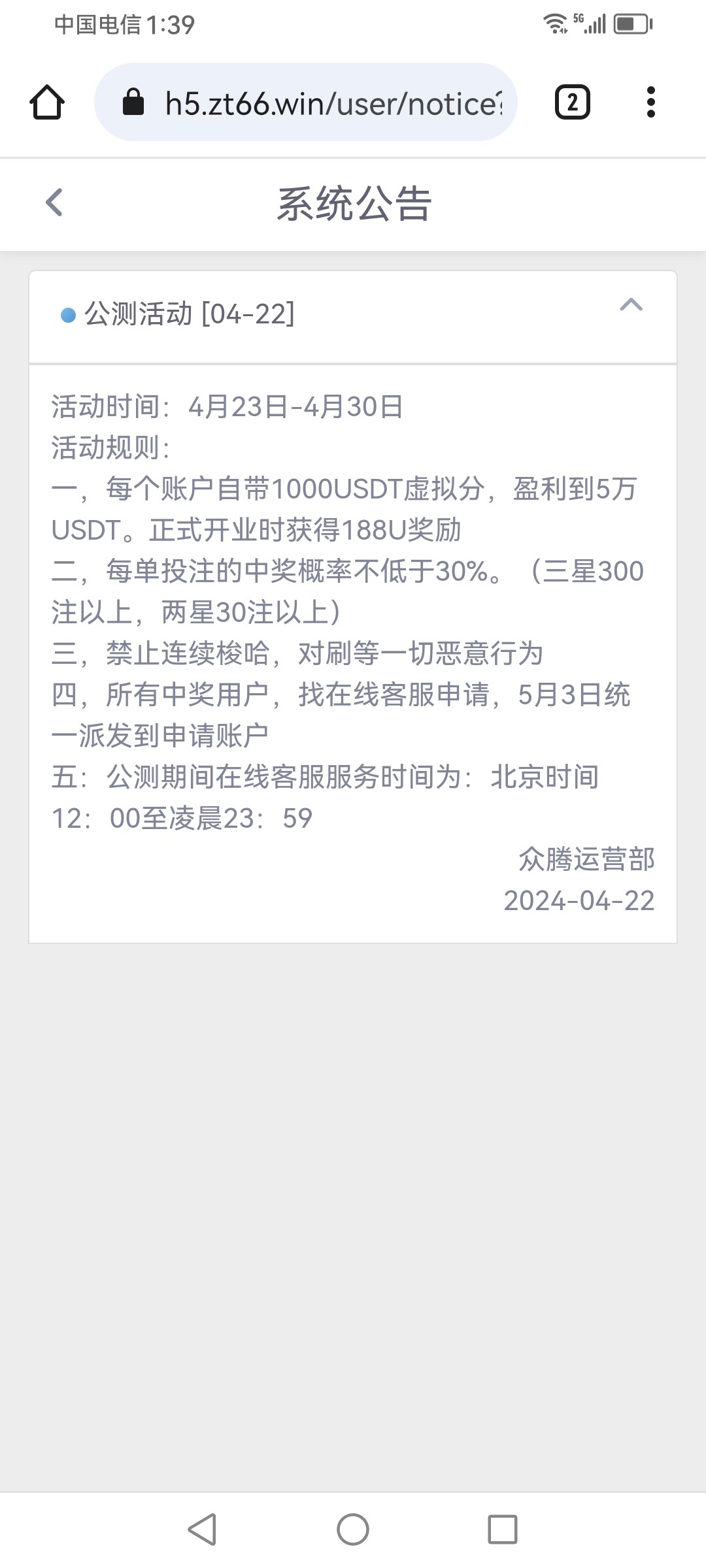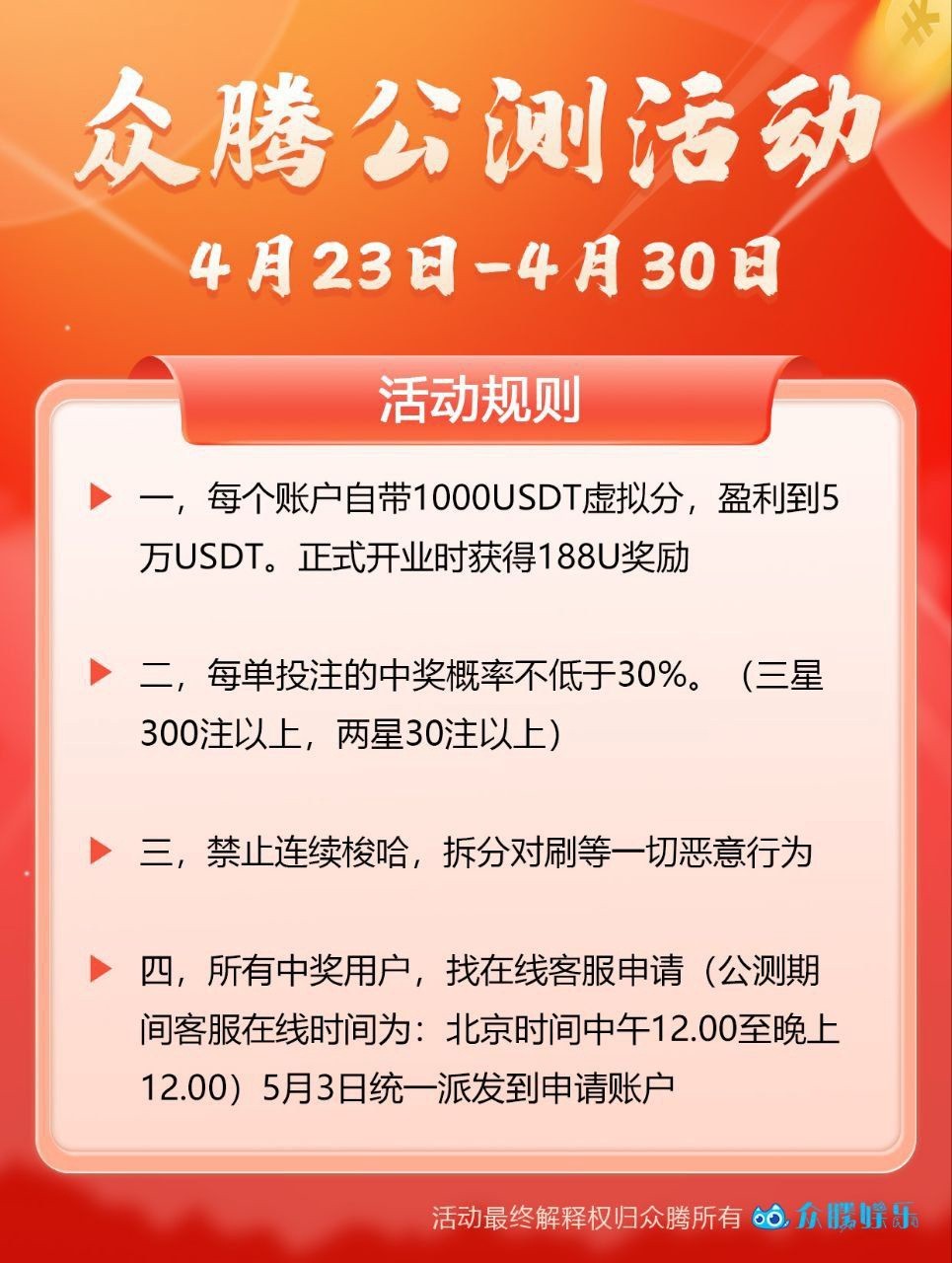 注册体验金1000u,盈利到50000u下分188u