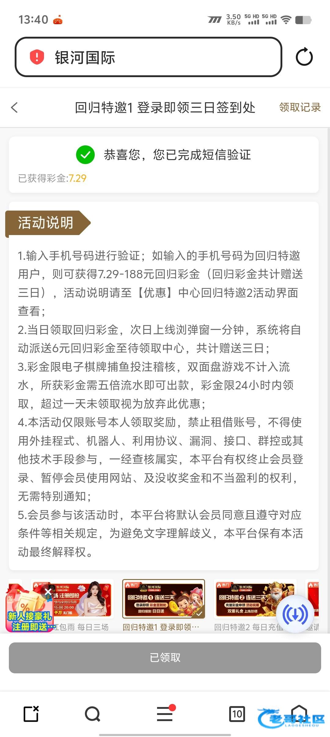 银河72991回归送3天没充值过,之前这个应该都有特邀,没注册的去碰特邀,注册过得去领回归连送3天打出评论一下老哥们网址72291.com