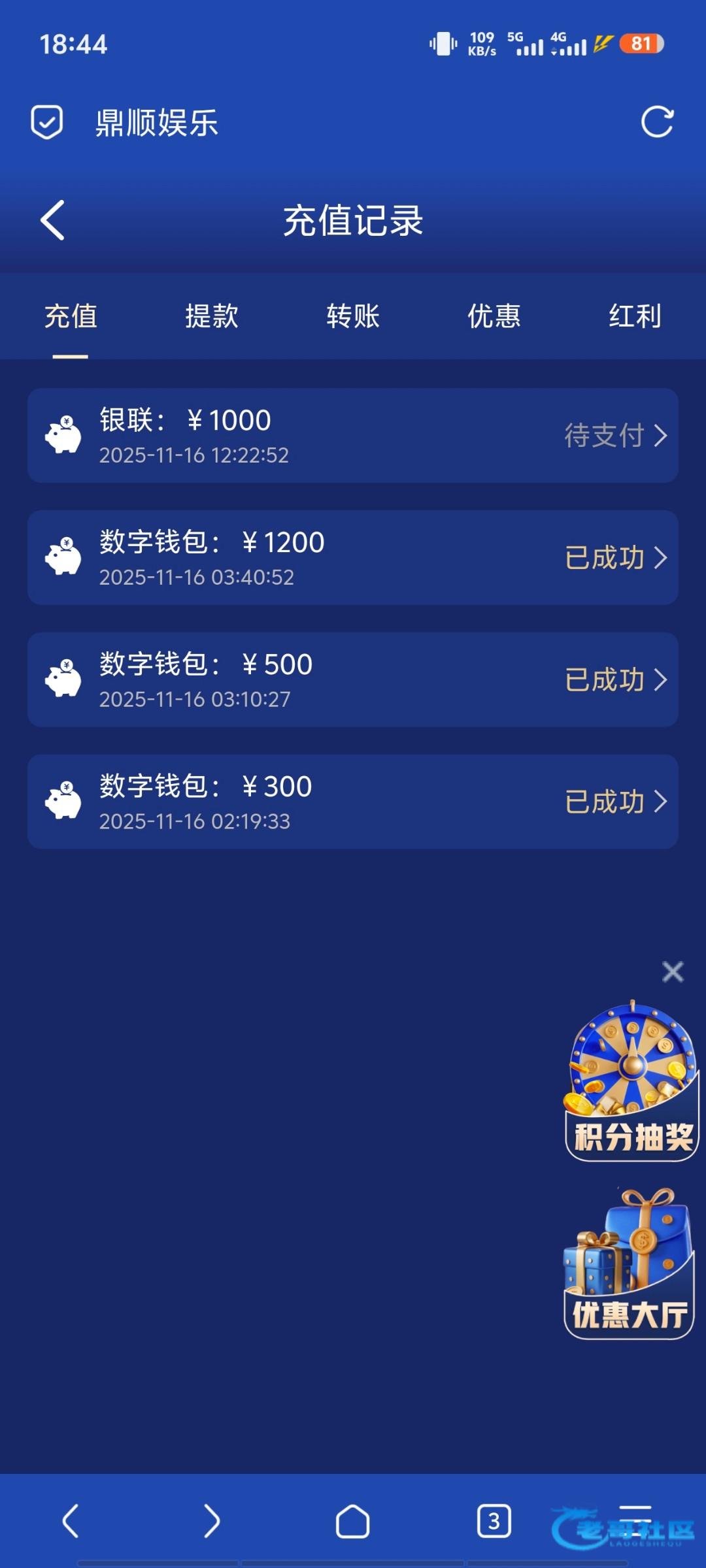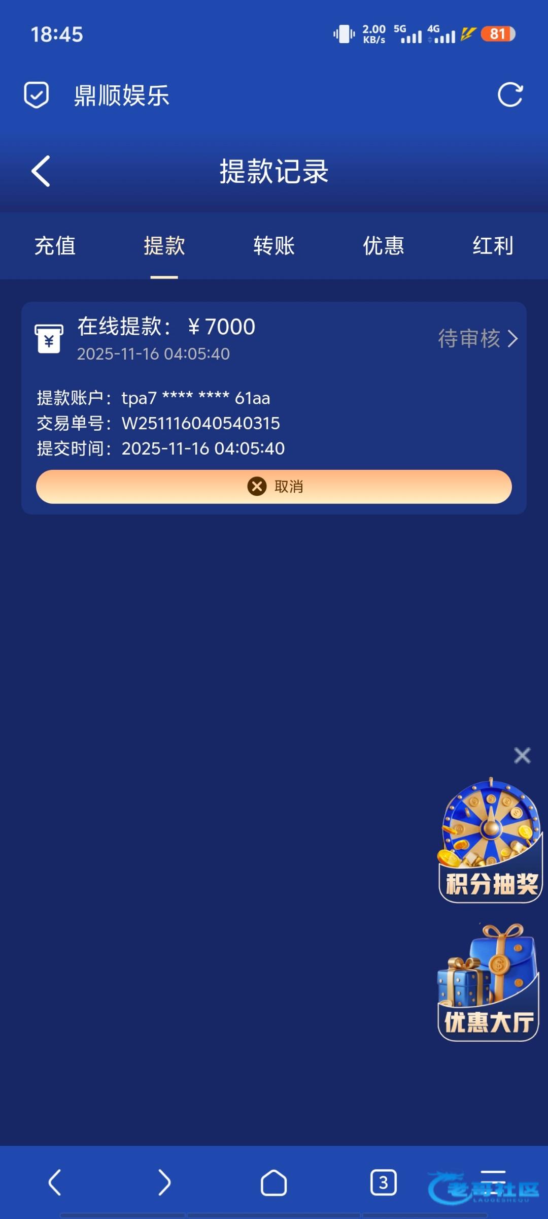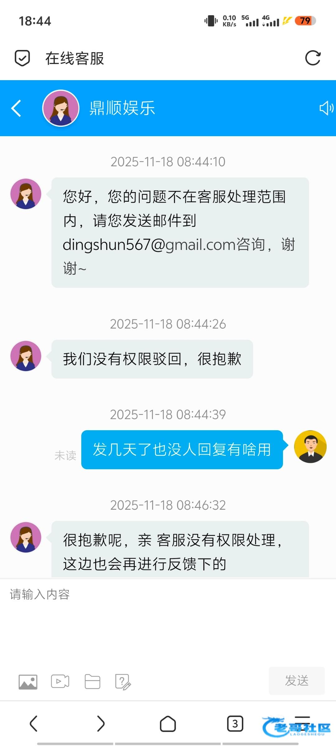事情是这样的11月16日晚上无聊注册的鼎顺娱乐前后充值2千,玩电子游戏,提款7千一直待审核,问客服客服各种踢皮球,一会说没权限处理,一会又让我发邮件给邮箱客服,各种推脱不给出款